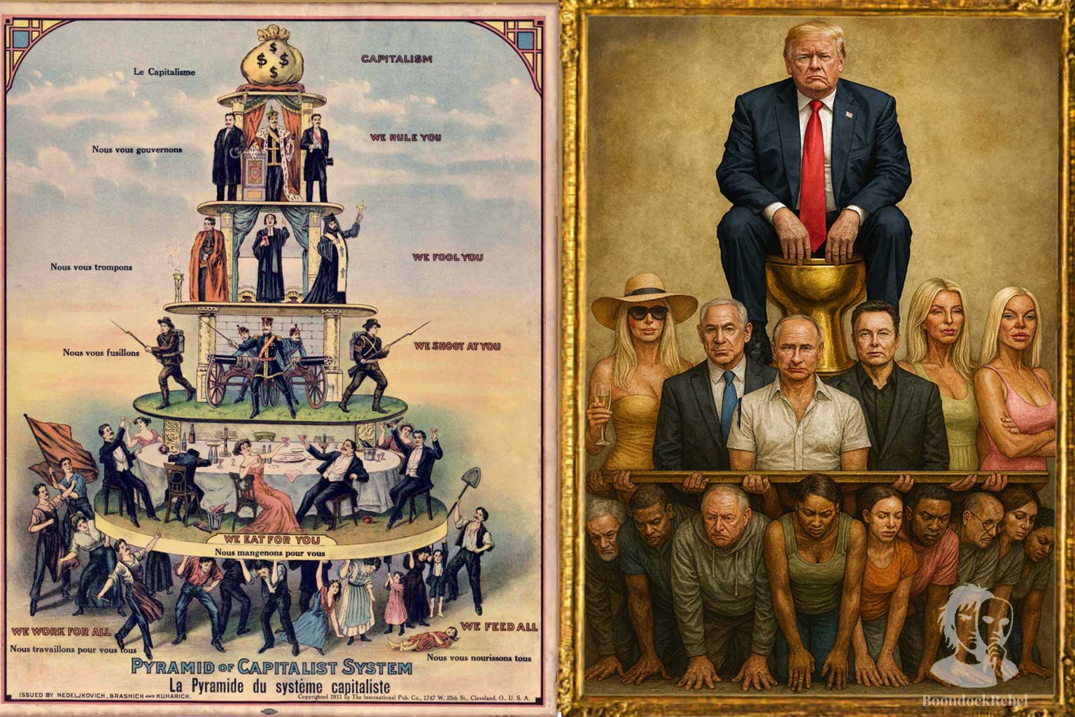 Put that 1911 image next to its modern-day counterpart, and the answer is obvious. The aesthetics have changed — suits instead of crowns, billionaires instead of barons — but the structure is nearly identical. The wealthy and powerful are perched above society, and below them are the people who get up at 4 a.m. to work, care for others, clean, build, and survive.